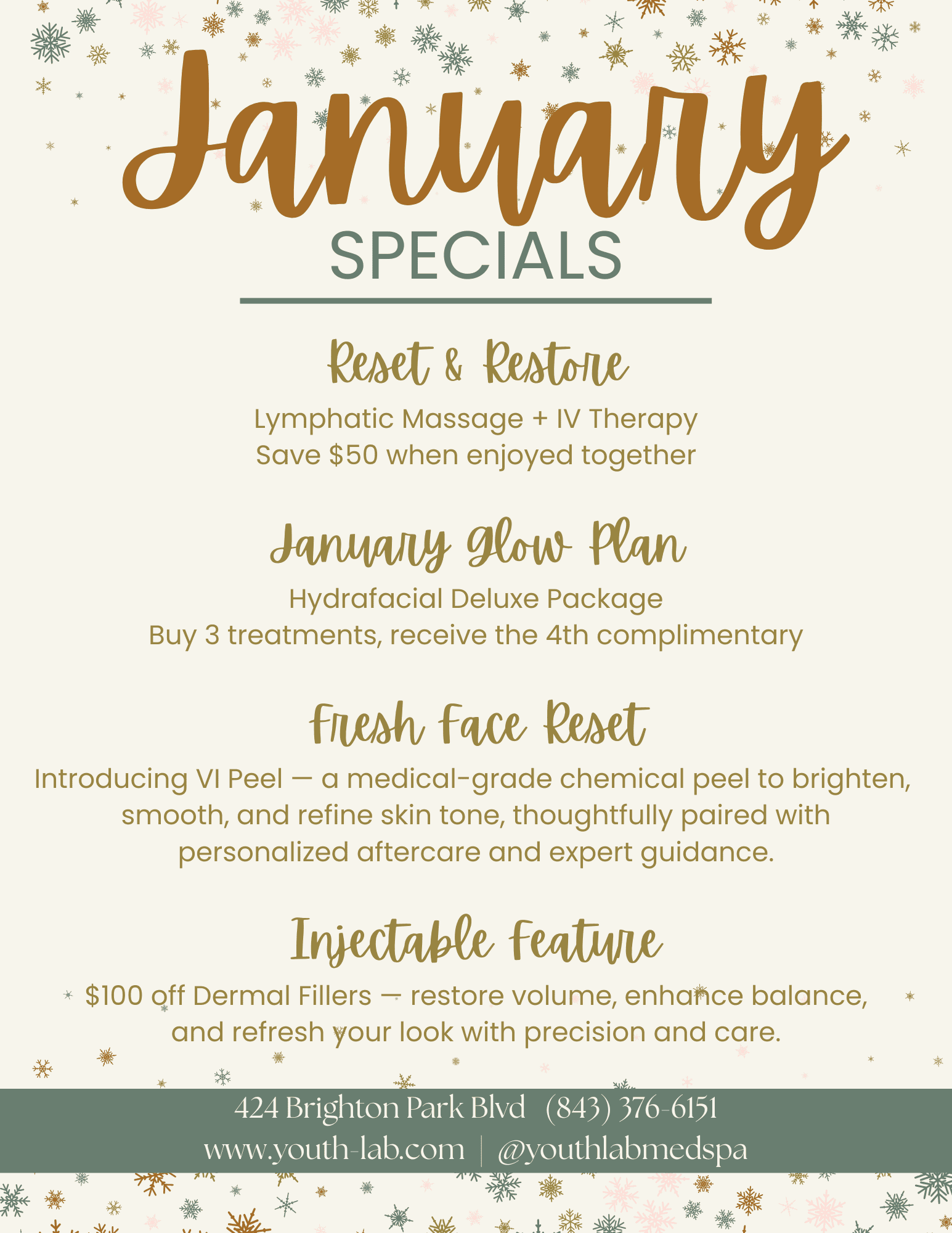January specials at Youth Lab Med Spa include Hydrafacial packages, VI Peel skin renewal, lymphatic massage + IV therapy bundles, and $100 off dermal fillers. Refresh, restore, and glow this season.